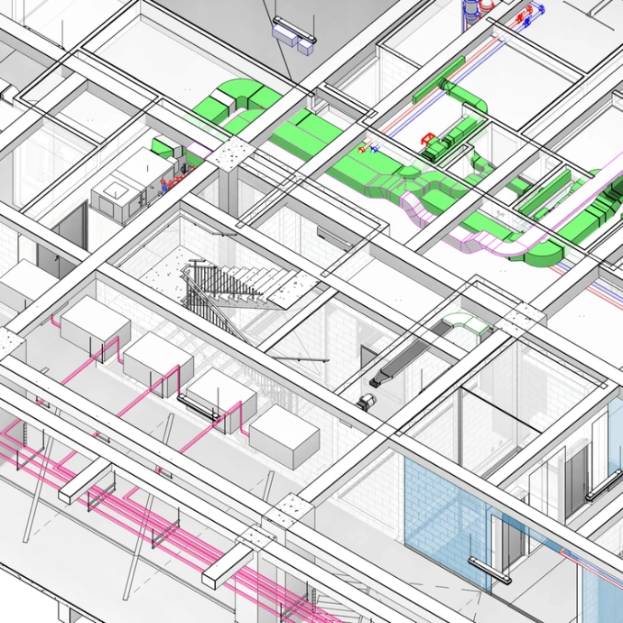 Integración arquitectura, estructura y MEP con control de interferencias y seguimiento, priorizados por impacto y trazabilidad de decisiones.